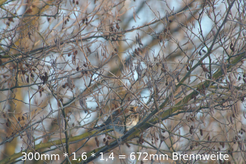 Durch den Crop Faktor der Kamera erhält das Objektiv einen Brennweiterverlögerung um den Faktor 1,6 mit dem Telekonverter erhält es zusätzlich den Faktor 1,4. Aus einem Objektiv mit Brennweite von 300mm wird an der APS-C Kamera entsteht umgerechnet ein Supertele mit 300mm*1,6*1,4=672mm Brennweite. Ich war gespannt, ob man damit den Autofokus nutzen kann und wie gut man entfernte Tiere heranholen kann. Mit einem AF Einzelfeld konnte ich den Vogel schafstellen.