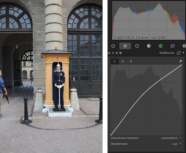 Die Tonwertkurve in L-Kanal arbeitet mit der Luminanz (Helligkeit), eine der drei Koordinaten des Lab-Farbraums. Zur besseren Übersicht wird die Luminanz des Input-Fotos als Histogramm im Diagramm angezeigt.