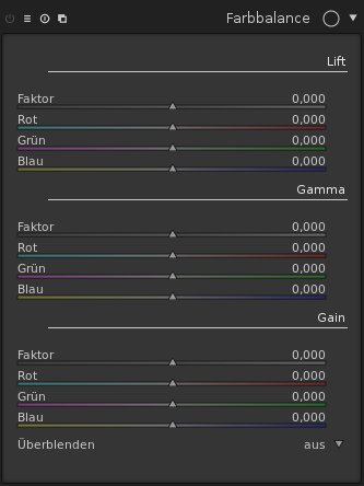 Für jede der drei primären Farben - rot, grün, und blau - gibt es einen Regler "Lift", "Gamma" und "Gain", um dunkle, mittlere und helle Farbtöne zu kontrollieren. Das Ändern dieser Parameter (zwischen -1 bis +1) fügt Konstanten (offsets) zu den individuellen RGB Kanälen hinzu und beeinflusst damit das Farbengleichgewicht des Fotos.