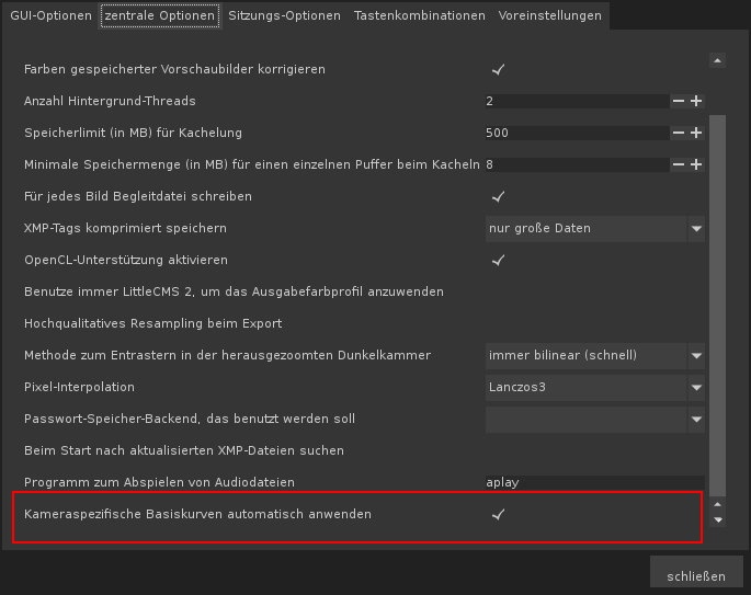 Darktable kommt mit voreingestellten Basiskurven die die Kurven der verschiedenen Hersteller nachbilden. Diese werden automatisch auf RAW-Bilder angewendet gemäß der in den EXIF-Daten gefunden Hersteller-ID. Für einige Kameramodellen kommt Darktable mit Basiskurven die für das jeweilige Modell angepasst sind. Eine Konfigurationsoption im Dialog globale Voreinstellungen (Registerkarte zentrale Optionen) legt fest, ob Darktable standardmäßig die pro-Kamera Basiskurve oder die Hersteller-Basiskurve anwendet.